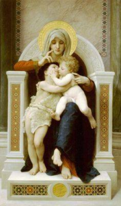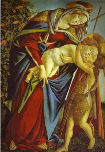 A marvelous painting by Botticelli depicting the Mother of God, the Child Jesus and His little cousin, John the Baptist. The Virgin is holding her Child. She bows low to allow the little Baptist to give her Jesus a hug and a kiss. The small boys appear to be about two years old. The Baptist has to stretch to reach the Face of Jesus; he is already dressed in his desert garb and carrying his little wooden staff. The top of the staff has the form of the Cross; the Cross thus appears directly over the head of the Infant Christ, a portent of His sacrifice. The Mother of God wears a blood red gown; suggests an outpouring of blood, an effusion of the heart and that the Divine Word wrapped Himself in Flesh from the Most Holy Virgin Mary.